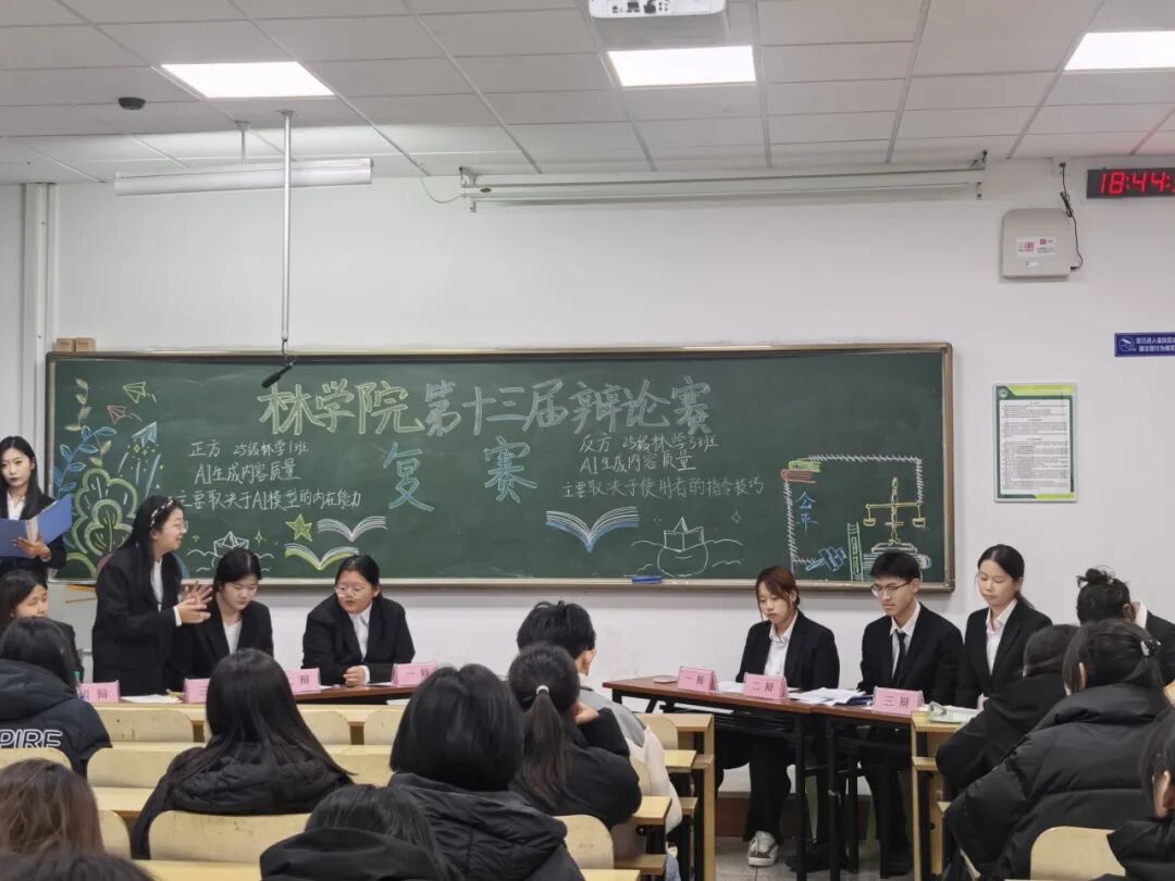 复赛阶段,辩题聚焦时代热点与校园日常,“AI生成内容质量的决定因素”“大学生宿舍关系的和睦之道”引发选手们更深层次的思考。25级林学1班、25级林学3班、25级林学2班、25级风景园林1班的辩手们攻防兼备、言辞犀利,在思想的碰撞中不断打磨观点,于唇枪舌战中展现缜密思维。最终,25级风景园林1班与25级林学3班凭借出色的临场应变与团队协作,杀出重围,挺进决赛巅峰对决。